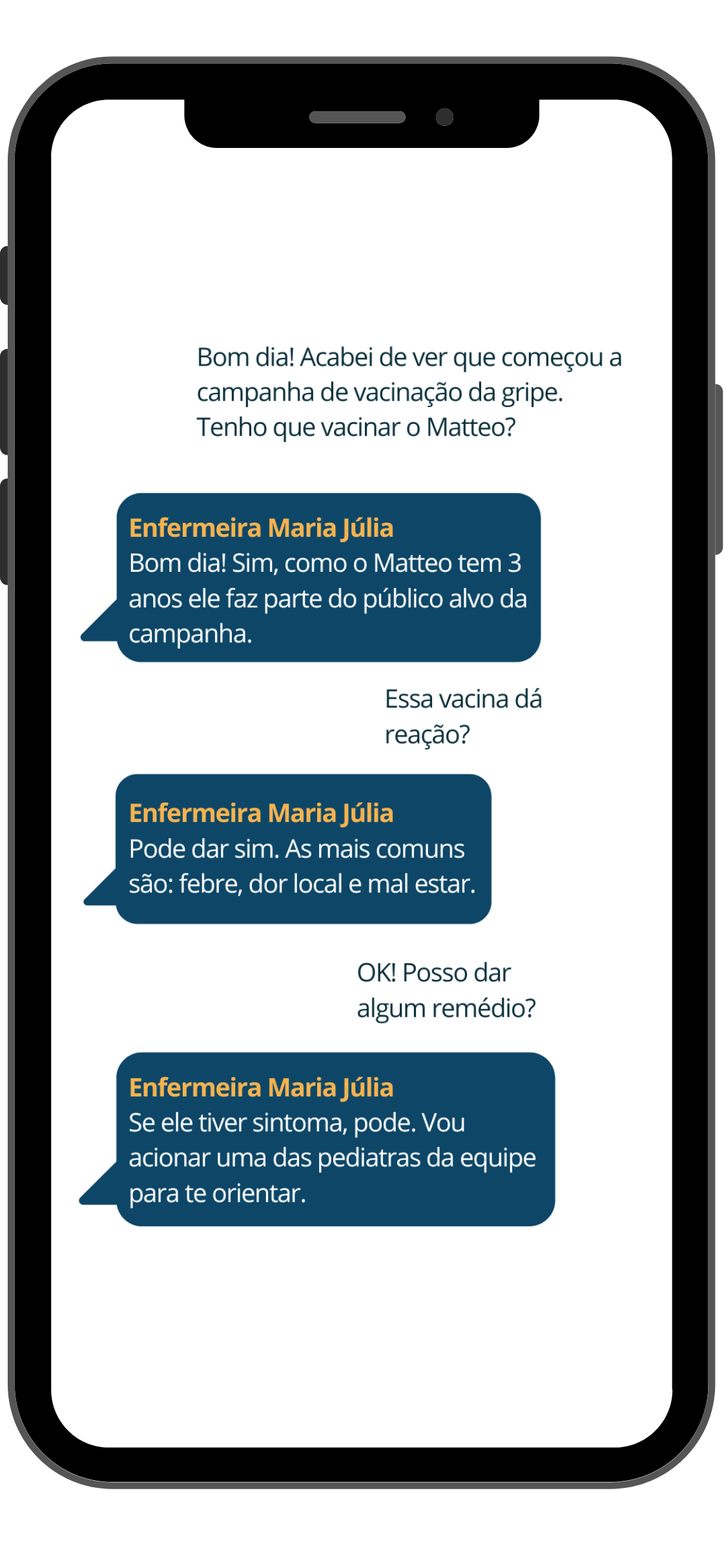 Os pacientes tiram dúvidas através do WhatsApp do seu pediatra de referência, enquanto a Kangoo fornece o suporte necessário para os atendimentos. Não falamos em nome do pediatra, o paciente sabe quando a equipe de saúde está atuando.